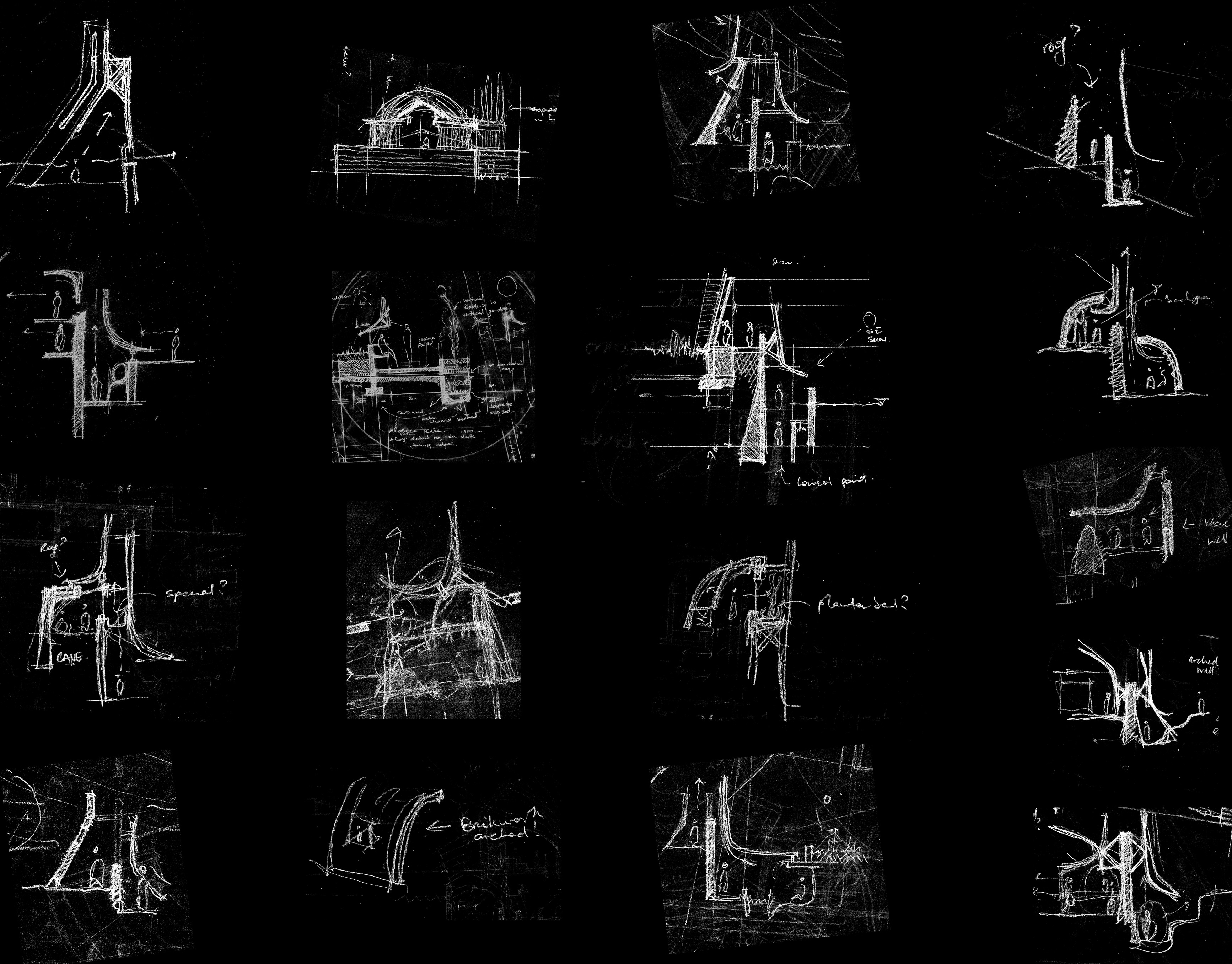 Sections exploring section spatial effect on the pedestrian. Plan sketches showing form and development