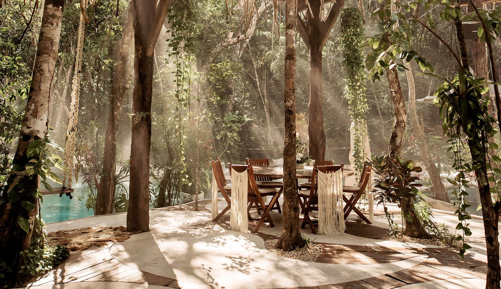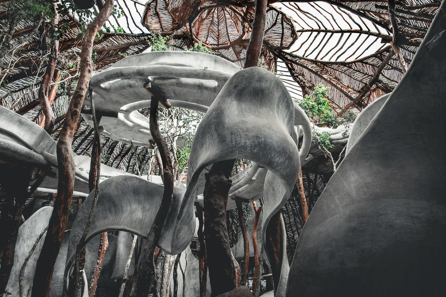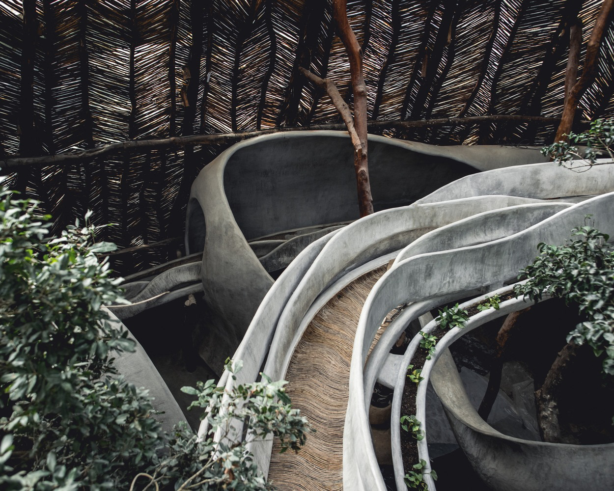 "The raw materials for producing cement are common in Mexico, as they are in many parts of the world, and an important cement-producing industry has developed. Imports of cement to Mexico are negligible, while it constitutes an important export item" (source: http://www.cemnet.co.uk, web page. 30 Aug. 2000). Mexico is renowned for concrete production, treating concrete as if it were clay or playdough. In Azulik, they explore concrete as an undulating material from floor to ceiling, finishing it off with a locally sourced wood called 'Bejuco'—a vine-like wood that behaves similarly to bamboo.