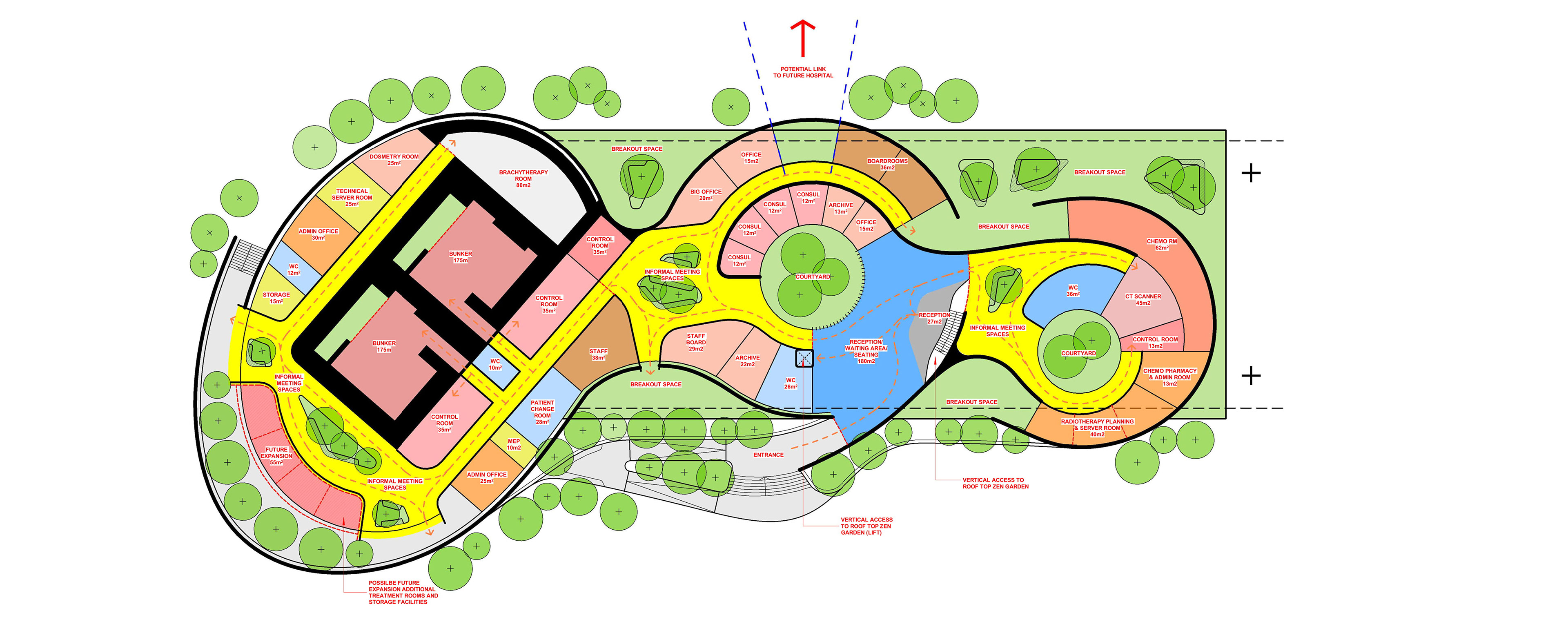This is a sculptural tender package for a Oncology center in Namibia. The concept design is geared at the integration of circulations, green spaces and curves. The strong emphasis on curves is based on the positive psycho-analysis that curves have on the human mind and body. Additionally curves equally distribute radio-active waves in the bunkers to possibly assist in better radiotherapy treatment (concept-phase theory).
