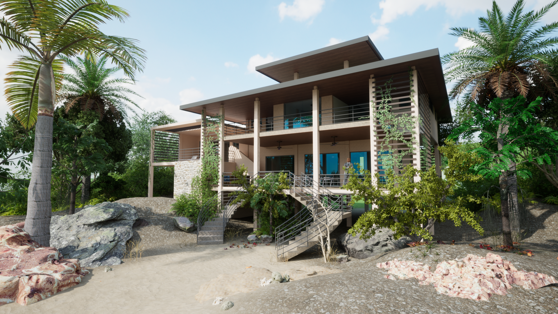 Hidden on the remote Little Cayman island, this plantation influenced residence is built for off-grid, high-end luxury with elevated spaces to maximize vistas of views. All circulation areas merge with deep outdoor decks and celebrate the warm easy climate of the Caribbean. This house holds 3 bedrooms each with their own bathroom on the third floor. The second floor holds an open plan living, dining and lounge area with clear views to the surrounds. The master bedroom lays on a split level between the Second and Third - providing more private deck space and surveillance. The ground floor is a wash through in preparation for any hurricane/raise in water levels. We are very proud of the design take on the plantation home with additions of modern shading devices, simplicity in construction, a play on the deck area and an addition of the widows walk.